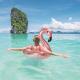 عوامة كبيرة بشكل فلامينغو مع تفاصيل جذابة مملوءة بالكونفيتي البراق، مثالية لصور الإنستغرام أو لحظات المرح في الماء.مناسبة للجميع