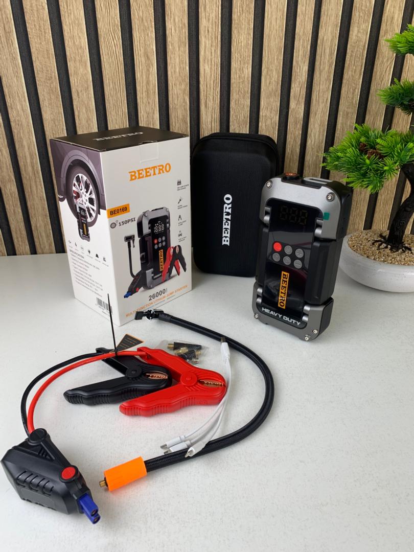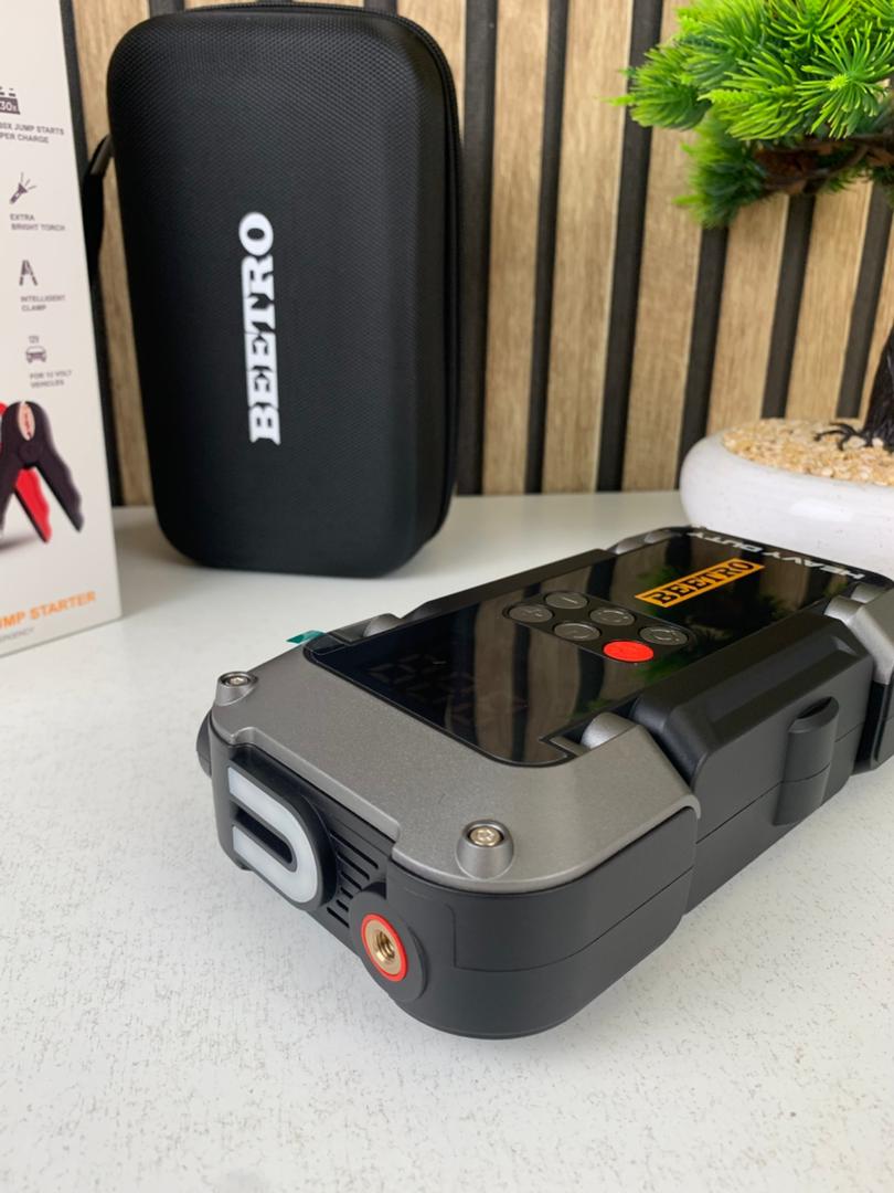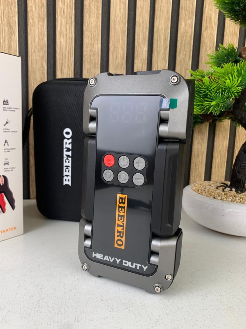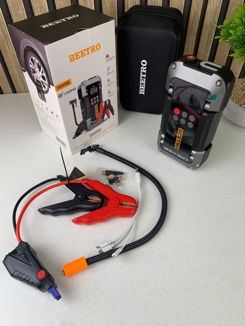 ⚙️ المواصفات الرئيسية :🔋 سعة البطارية: 26000mAh / 96.2Wh⚡ تيار البدء: 3750A — لتشغيل السيارات في ثوانٍ🔌 منافذ الشحن:Type-C (5V/3A, 18W) للشحن السريع3 منافذ USB (5V/3A, 9V/2A, 12V/1.5A) لشحن الهواتف، الحواسيب اللوحية والمحمولة💨 ضاغط هواء مدمج مع 4 أوضاع لنفخ الإطارات، المراتب، الكرات وغيرها🔦 كشاف LED قوي مع أوضاع إضاءة متعددة (عادي / وامض / تحذيري)🔋 Power Bank لشحن جميع أجهزتك أثناء التنقل📏 الأبعاد: 210 × 106 × 50 مم🌡️ درجة الحرارة التشغيلية: من -20°C إلى +60°C🌟 المميزات :✅ يشغل سيارتك في ثوانٍ حتى في الطقس البارد