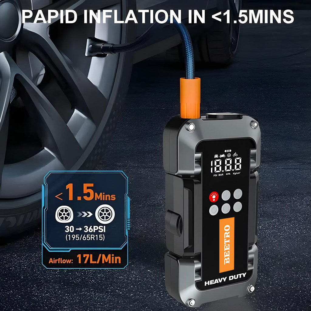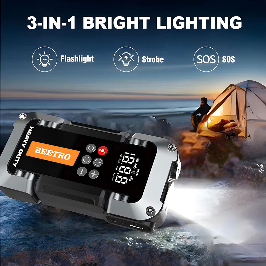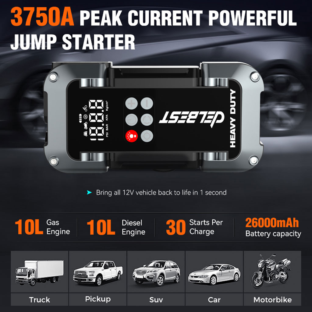 ⚙️ المواصفات الرئيسية :🔋 سعة البطارية: 26000mAh / 96.2Wh⚡ تيار البدء: 3750A — لتشغيل السيارات في ثوانٍ🔌 منافذ الشحن:Type-C (5V/3A, 18W) للشحن السريع3 منافذ USB (5V/3A, 9V/2A, 12V/1.5A) لشحن الهواتف، الحواسيب اللوحية والمحمولة💨 ضاغط هواء مدمج مع 4 أوضاع لنفخ الإطارات، المراتب، الكرات وغيرها🔦 كشاف LED قوي مع أوضاع إضاءة متعددة (عادي / وامض / تحذيري)🔋 Power Bank لشحن جميع أجهزتك أثناء التنقل📏 الأبعاد: 210 × 106 × 50 مم🌡️ درجة الحرارة التشغيلية: من -20°C إلى +60°C🌟 المميزات :✅ يشغل سيارتك في ثوانٍ حتى في الطقس البارد