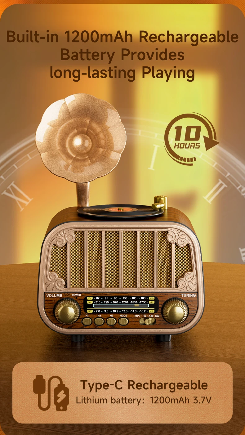 ⭐ المميزات :🎨 تصميم ريترو أنيق يضيف لمسة ديكور فاخرة لأي مكان.📡 يدعم جميع الموجات : FM / AM / SW للاستماع لمجموعة واسعة من المحطات.🔊 قوة صوت 10 – 30 واط : صوت قوي وواضح يناسب كل المناسبات.📲 بلوتوث مدمج : للاتصال اللاسلكي السريع بالهاتف أو الأجهزة الأخرى.💾 منافذ USB & TF : لتشغيل الأغاني مباشرة من الفلاش أو الكارت ميموار.🔋 بطارية ليثيوم قابلة للشحن (3.7V) بسعة 1001 – 1500mAh تمنحك مدة تشغيل طويلة.💡 شاشة LED واضحة لعرض المعلومات بسهولة.🏠 مثالي للاستعمال في الدار، المكتب أو حتى فالخارج.📏 المواصفات التقنية :الموديل : MD-1319BT.الموجات : FM (64 – 108 MHz) / AM / SW.الوظائف : بلوتوث – USB – TF – شاشة LED.المادة : بلاستيك بجمالية ريترو.القدرة الصوتية : 10 – 30 واط.البطارية : ليثيوم بوليمير 3.7V / سعة 1001 – 1500 mAh.الأبعاد : 148 × 105 × 220 مم.اللون : تشطيب ريترو أنيق.✅ جهاز يجمع الروح الكلاسيكية مع التكنولوجيا العصرية – صوت قوي، تصميم أنيق، واستخدام مرن أينما كنت.